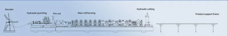 Mashine ya kutengua → Kuunda mandrel → Mfumo wa haidrauli → Mfumo wa kudhibiti otomatiki → Utaratibu wa kuunda hatua kwa hatua → Utaratibu wa kukata manyoya otomatiki → Jedwali lililokamilishwa la kupokea bidhaa. Michakato ya msingi ni pamoja na kuchomwa kwa majimaji na kukata kwa majimaji.